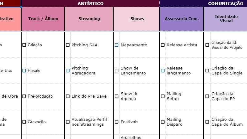 Materiais de trabalho que vão te auxiliar na realização das tarefas de produção, venda de shows, lançamentos e gestão de carreira, como planilhas, checklists, mapeamentos, cronograma e mais.